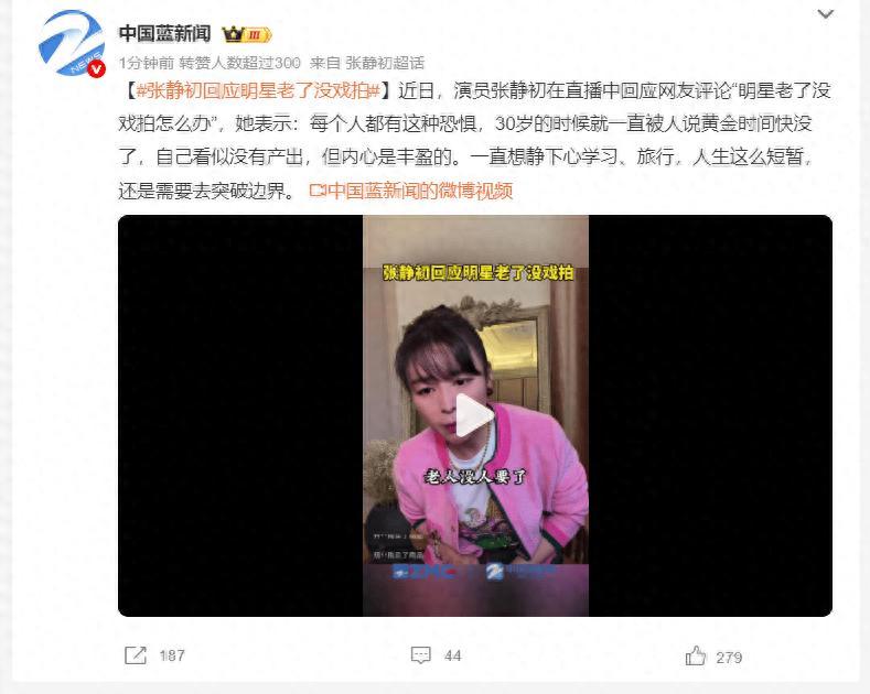 近日,演員張靜初在直播中回應網友評論“明星老了沒戲拍怎麼辦”,她表示:每個人都有這種恐懼,30歲的時候就一直被人說黃金時間快沒了,自己看似沒有產出,但內心是豐盈的。一直想靜下心學習、旅行,人生這麼短暫,還是需要去突破邊界。