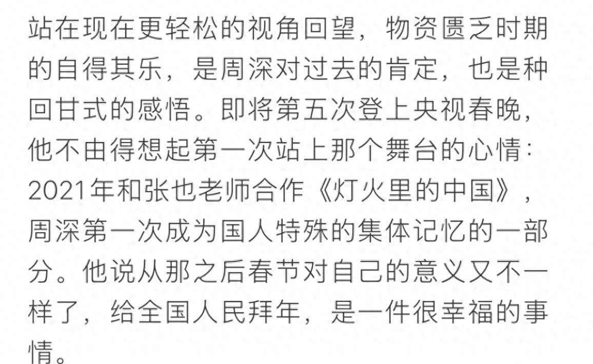 搜狐娛樂訊 近日,歌手周深在接受雜誌採訪時回憶第一次登上春晚的心情,表示從那以後春節對自己的意義又不一樣了,給全國人民拜年是件很幸福的事,此外他還表示覺得這十年間自己最大的變化是有安全感了,話也變多了,很感謝和珍惜粉絲。