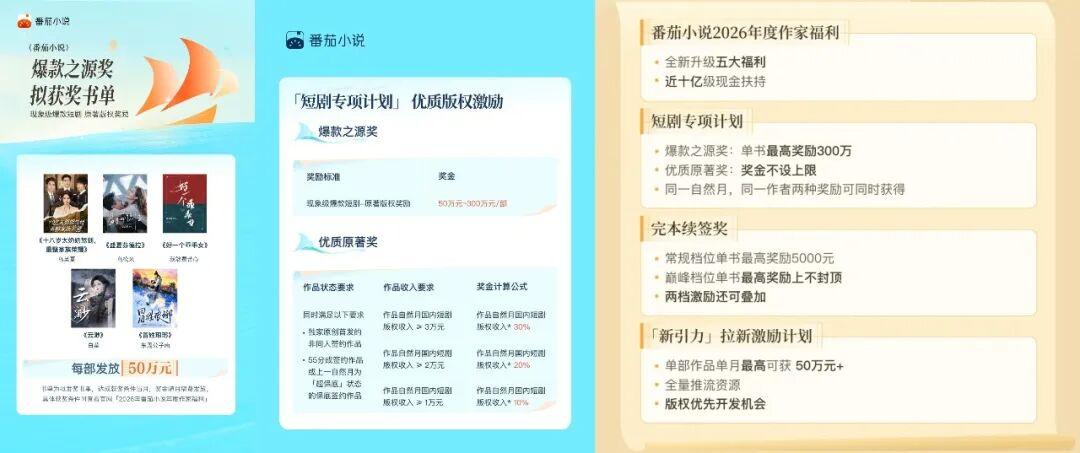 步入2026年,番茄小說還發布了2026年度作家福利,包含了各項激勵政策,其中,針對爆款短劇原作的激勵機制也爲優質作者直接“增收”。規則顯示,針對現象級爆款,番茄小說會給與原著版權作者每部50萬元的獎金。此外,激勵中還包含了針對精品內容題材、拉新拓客等方向,都進一步鼓勵創作者堅持原創,堅持創作更多元題材、更具當代氣質的好內容。