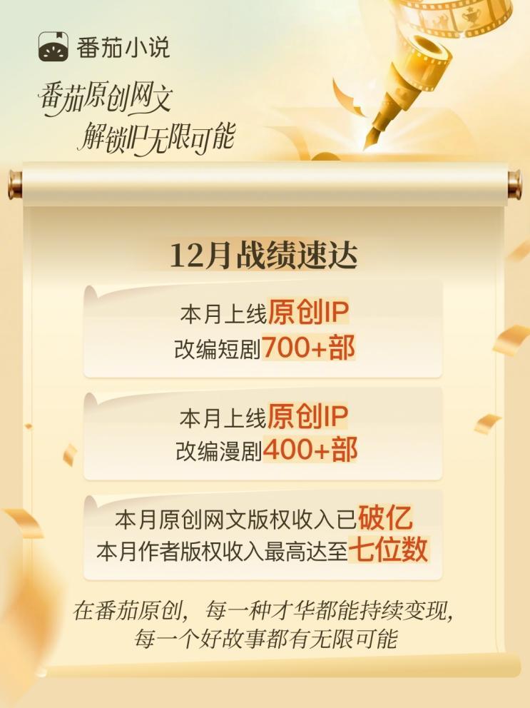 同時,目前番茄小說也不斷完善IP孵化鏈條,尤其是在短劇開發領域,大批潛力作品進入IP改編庫,面向全網短劇創作者。平臺也會在資金、內容等多維度助力改編流程的推進,確保有潛力的小說可以順利進入開發,讓作者收穫更多元的關注與收益。據悉,去年12月,番茄小說上線的原創IP中,改編短劇的超過700部,改編漫劇的超過400部,原創網文版權收入破億,當月作者版權收入最高達到百萬量級。