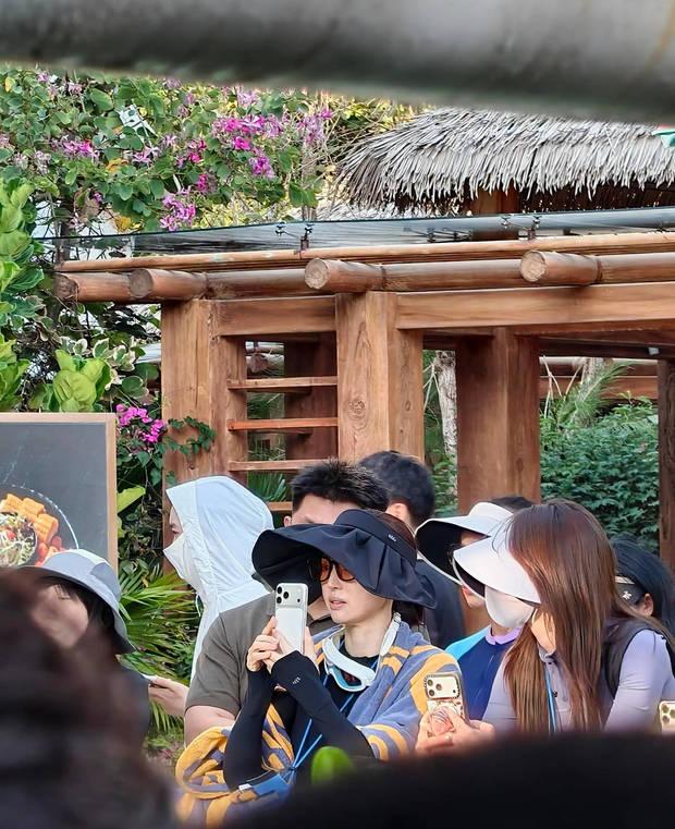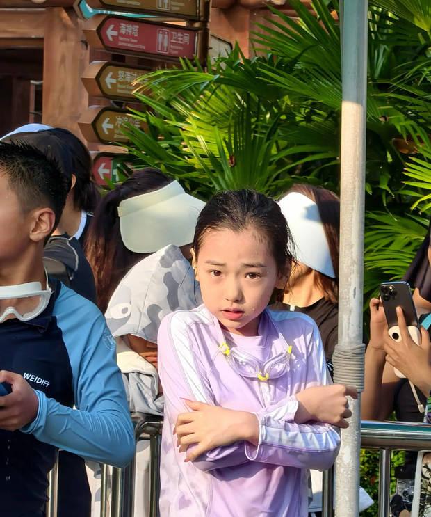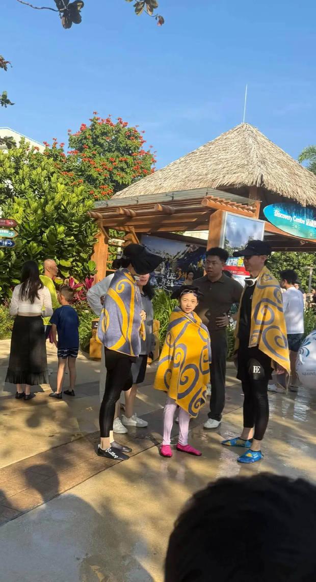 董璇與小酒窩、張維伊剛玩完水,都披着毯子保暖。