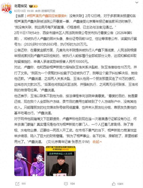 2月12日晚,對於多家媒體報道知名相聲演員盧鑫失聯被法院公開懸賞一事, 盧鑫接受北京青年報記者獨家採訪時表示,“我沒有失聯,我這倆月每天都直播,行程透明,已主動與法官溝通過。”