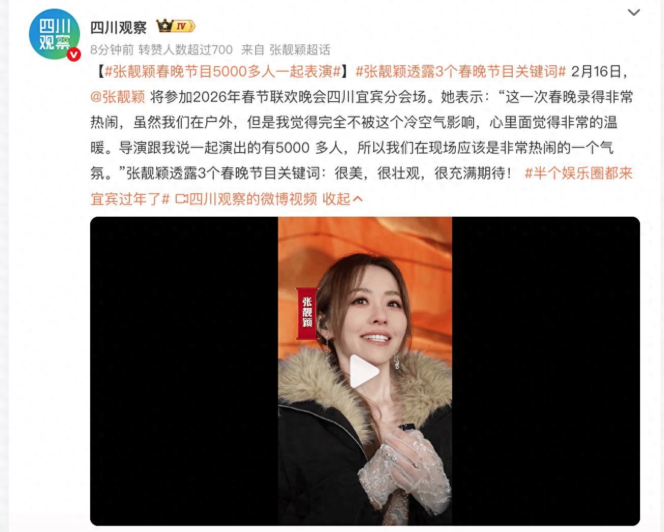 2月16日,張靚穎將參加2026年春節聯歡晚會四川宜賓分會場。她表示:“這一次春晚錄得非常熱鬧,雖然我們在戶外,但是我覺得完全不被這個冷空氣影響,心裏面覺得非常的溫暖。導演跟我說一起演出的有5000 多人,所以我們在現場應該是非常熱鬧的一個氣氛。”張靚穎透露3個春晚節目關鍵詞:很美,很壯觀,很充滿期待!