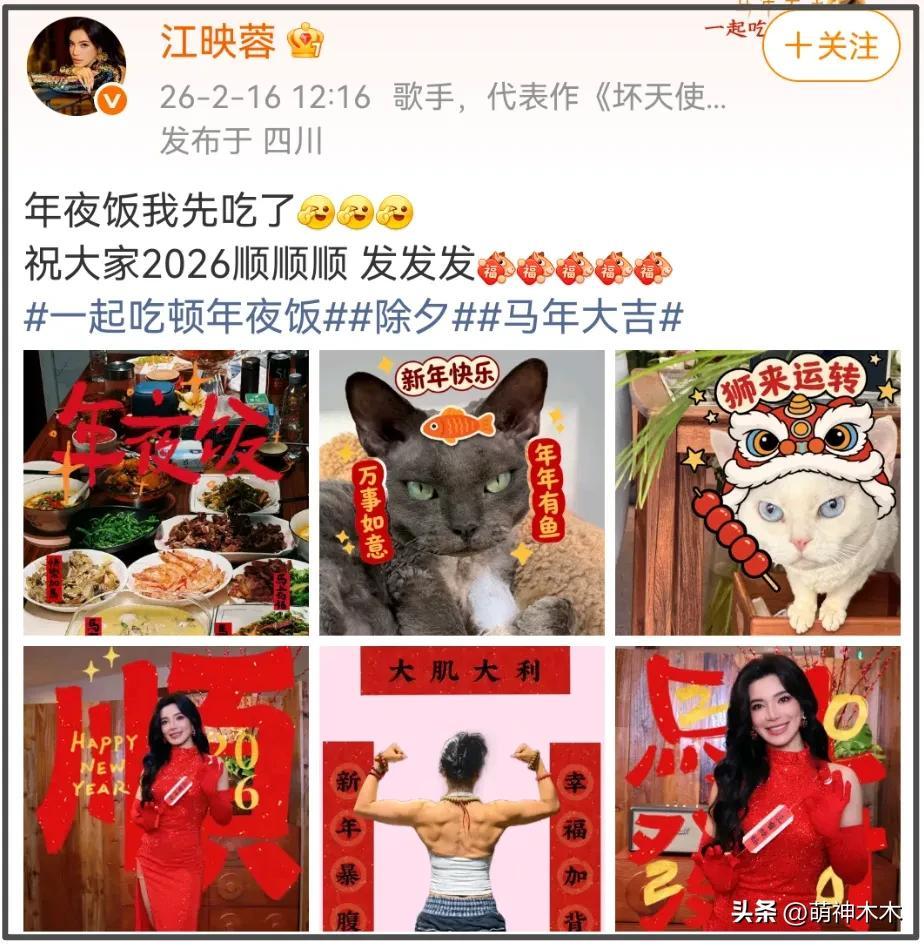 江映蓉曬出自家的年夜飯,葷素搭配,非常豐盛。碗裏的辣椒和四川ip對上了,頗具地域特色。