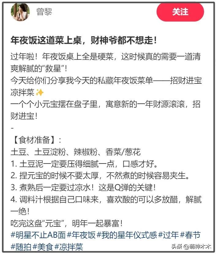 曾黎也在社媒曬出自家的年夜飯教程,既解膩寓意也很好,曾黎還親自下廚做飯,成品賣相非常不錯,光看就讓人流口水。