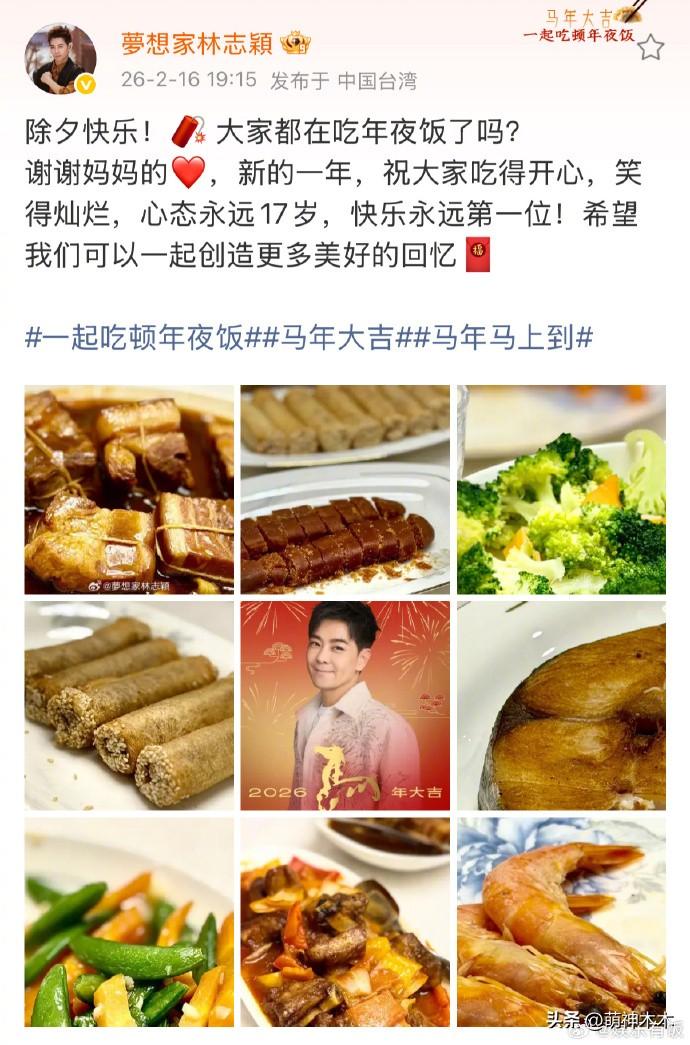 同樣在臺灣省過年的林志穎,曬出了一桌子豐盛的年夜飯,葷素搭配,十分家常。
