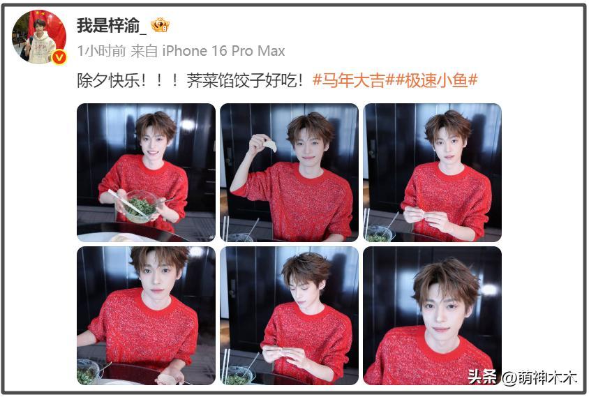 梓渝也曬出包餃子的照片,還發文說薺菜餡的餃子好喫。從和餡到包餃子,梓渝都全過程記錄,穿着紅毛衣,很有過年的氣息。