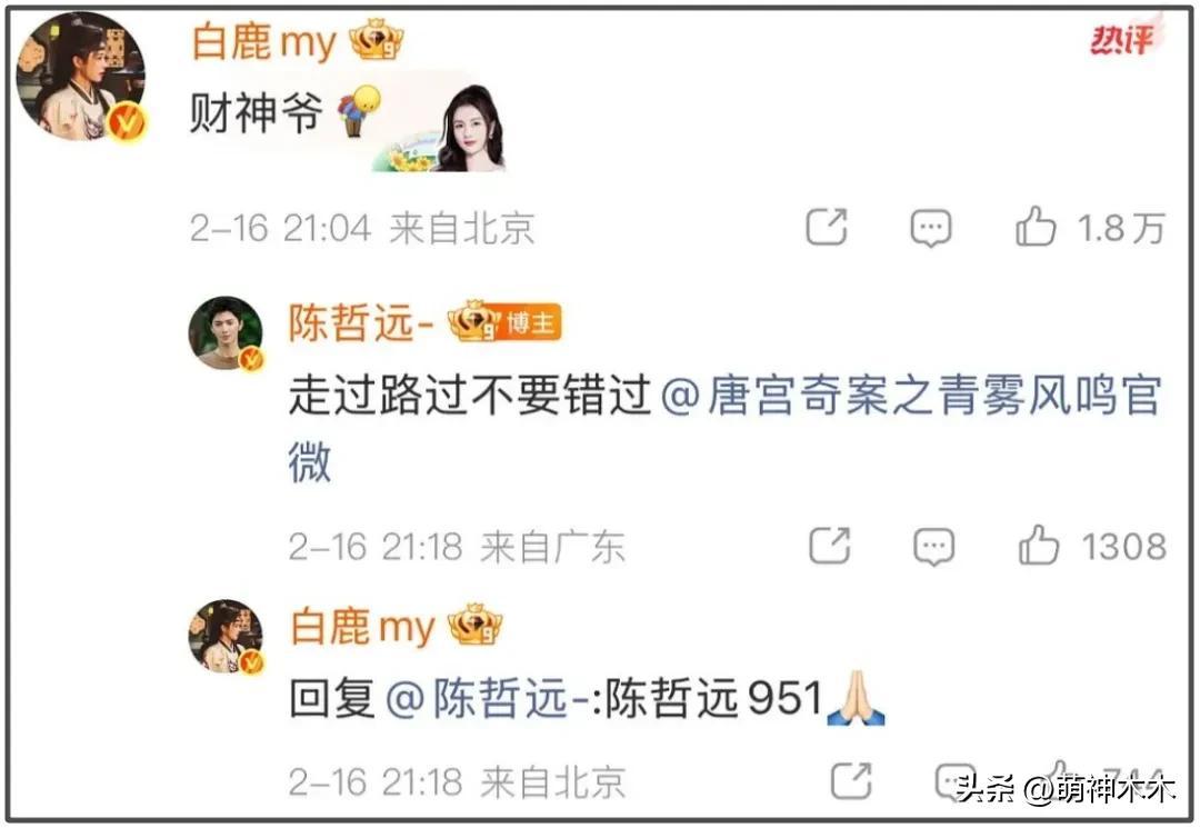 陳哲遠也開始禮尚往來幫忙宣傳白鹿新劇,白鹿直接開玩笑誇他是“951”(95生第一)。