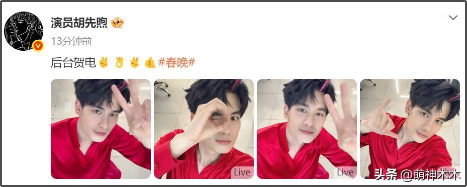 胡先煦也曬出自己在後臺的自拍,配文“後臺賀電”,擺出了“2026”的手勢,來和觀衆一起過年。