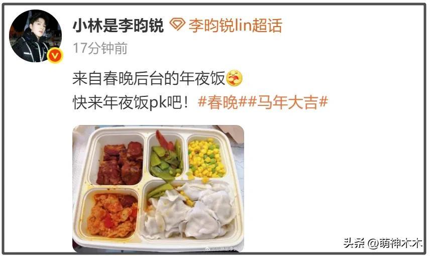 回到後臺之後,也加入了明星曬年夜飯的大軍,不過李昀銳曬出的是春晚盒飯。春晚節目組的盒飯菜色不錯,四個菜葷素均衡,還有過節必不可少的餃子,很豐盛了。