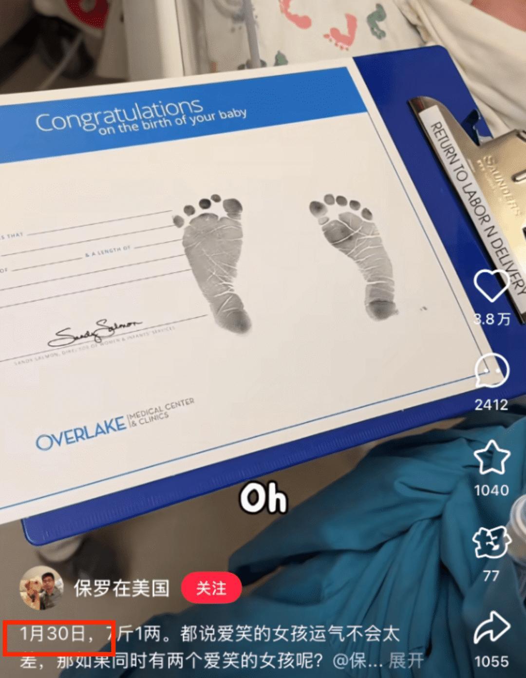 2月7號,千萬網紅博主「保羅在美國」發佈了妻子「甜品大師」的生娃vlog