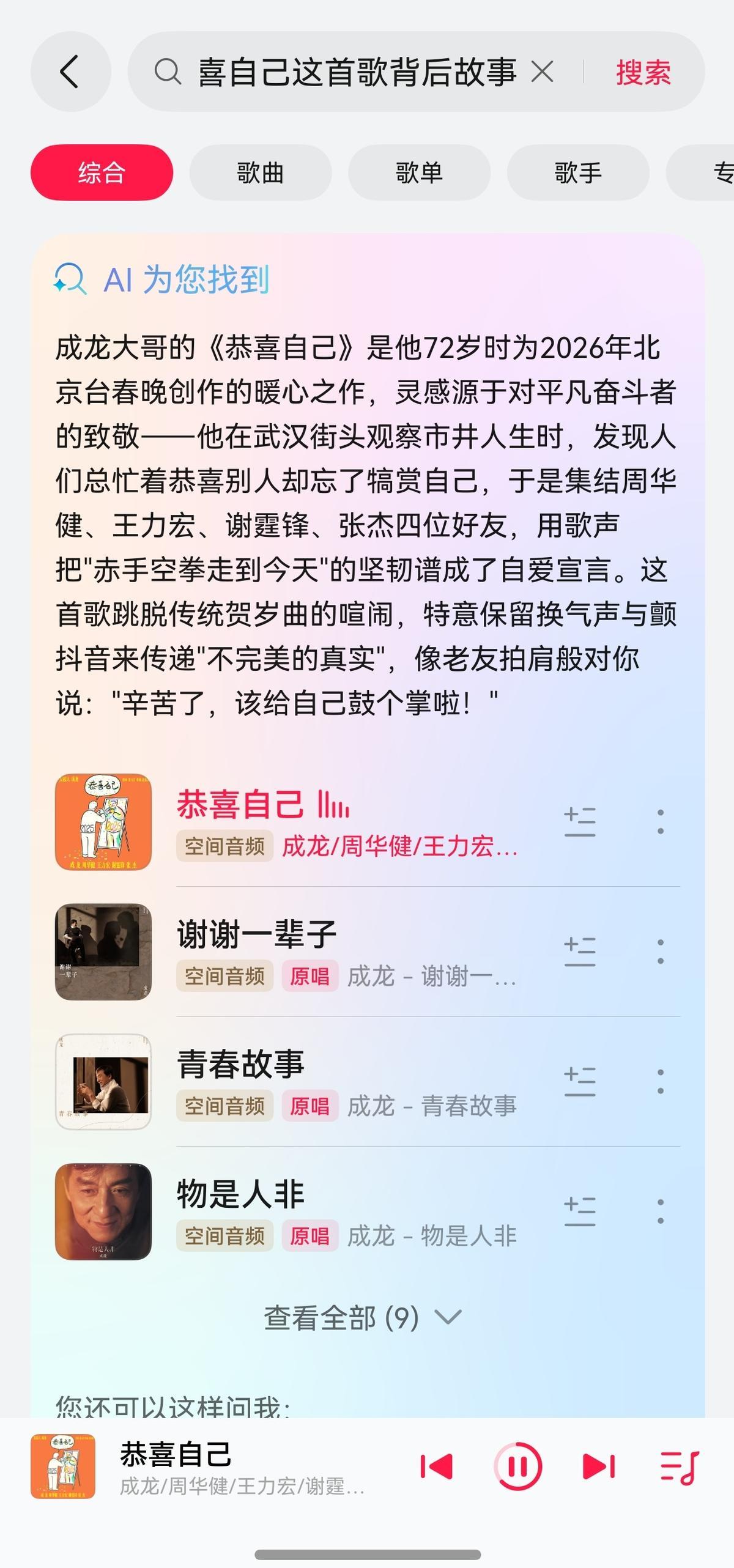 聽歌時我更好奇這首歌背後的故事,就點開華爲音樂,直接在頂部搜索欄輸入疑惑:“《恭喜自己》背後的創作故事是什麼?”AI搜就能秒出回答——這是成龍大哥親自發起的暖心之作,並挨個打電話邀約四位歌手傾情演唱。讓人在收穫溫馨的同時,更能收穫一份新一年繼續努力生活的勇氣。