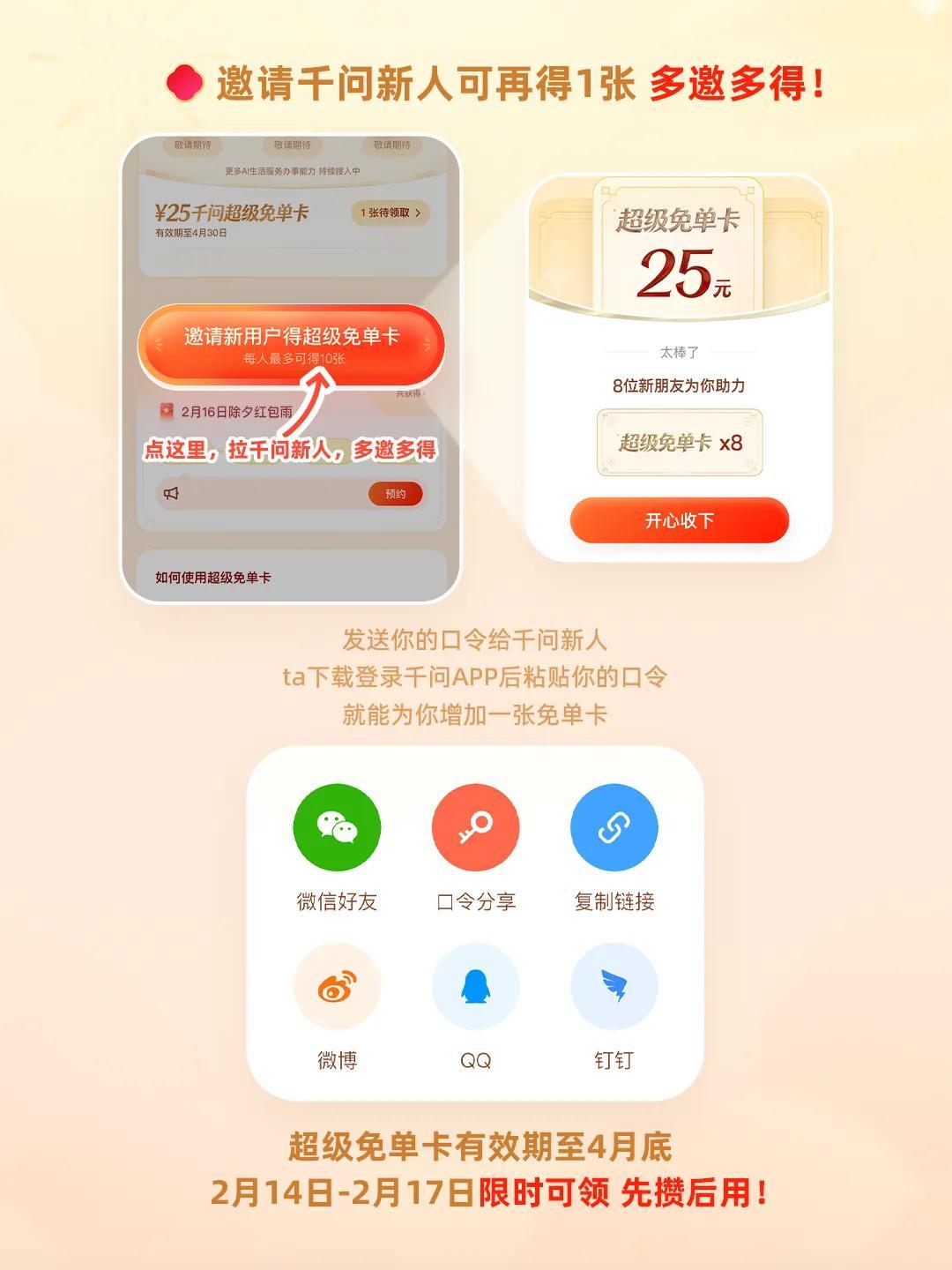 在2月14號到17號期間,千問的新用戶都可以在app內領一張25元超級免單卡,