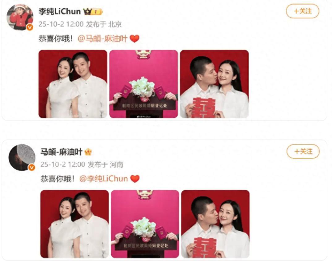 據公開資料,2025年10月2日,李純官宣與馬頔結婚。兩人曬出紅底照和領證現場照片,並互相喊話:“恭喜你哦!”