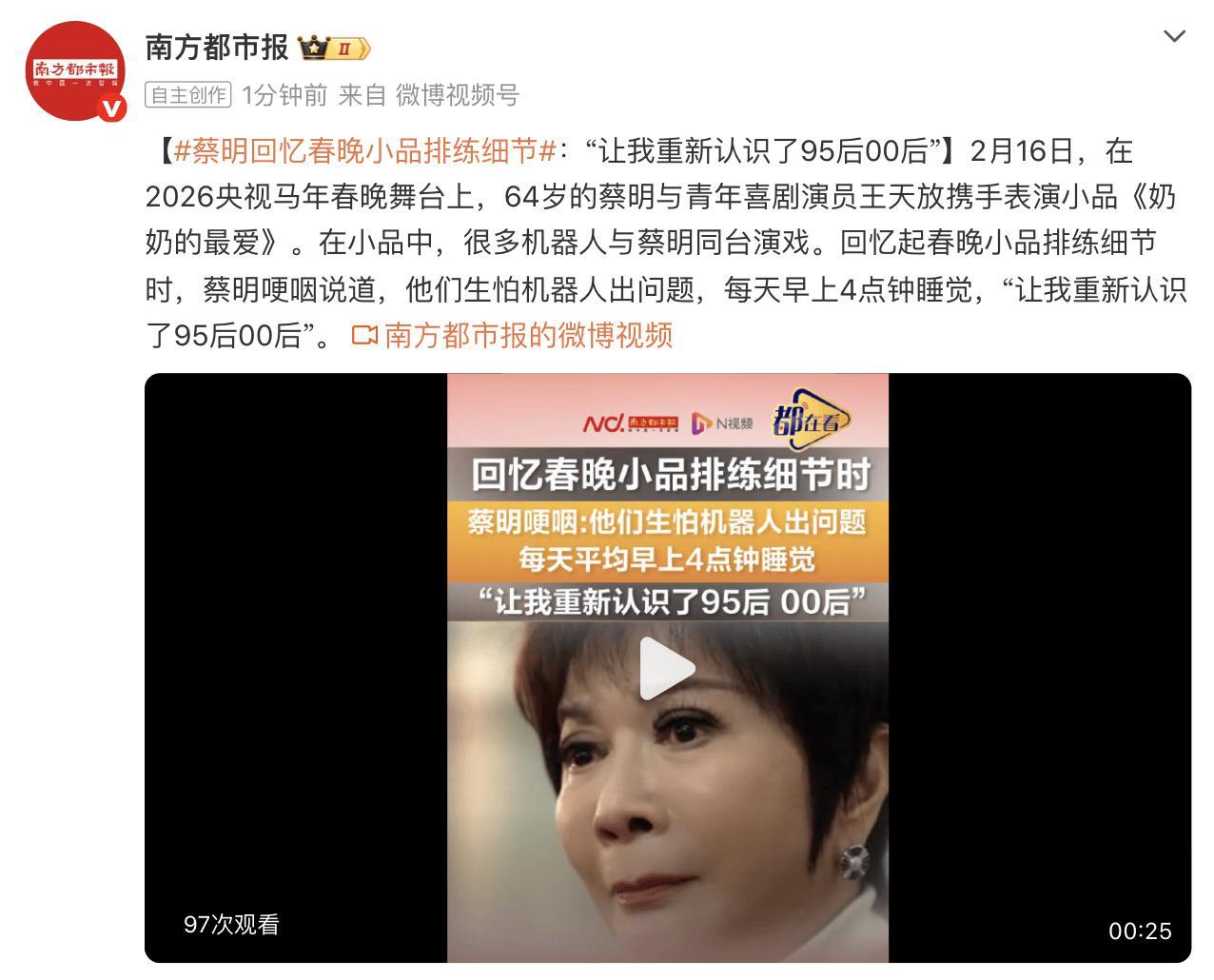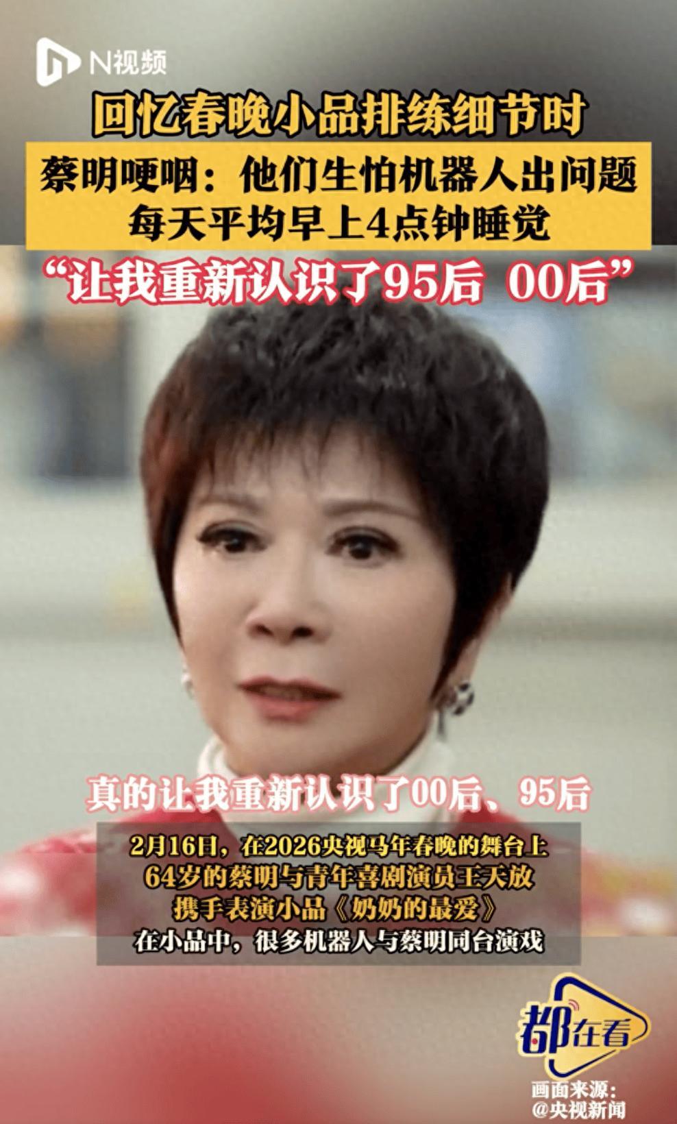 2月16日,在2026央視馬年春晚舞臺上,64歲的蔡明與青年喜劇演員王天放攜手錶演小品《奶奶的最愛》。在小品中,很多機器人與蔡明同臺演戲。回憶起春晚小品排練細節時,蔡明哽咽說道,他們生怕機器人出問題,每天早上4點鐘睡覺,“讓我重新認識了95後00後”。