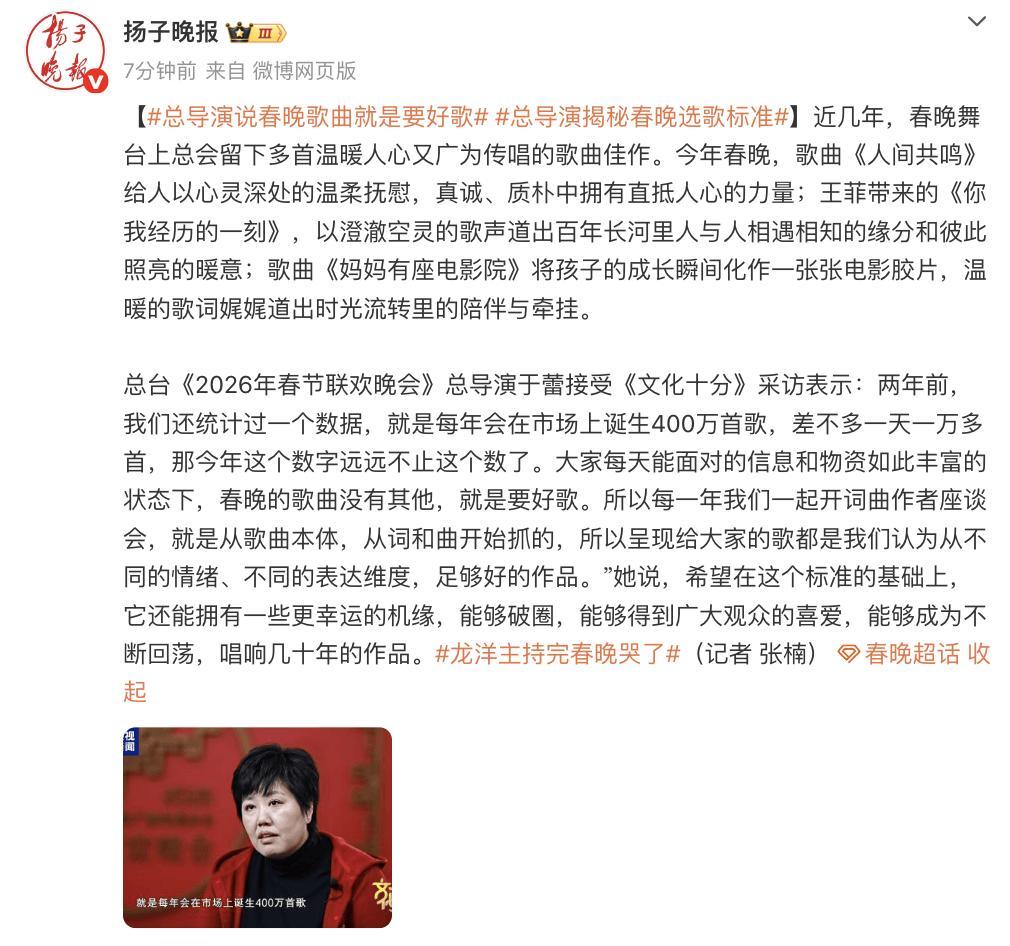總檯《2026年春節聯歡晚會》總導演於蕾接受《文化十分》採訪表示:“兩年前,我們還統計過一個數據,就是每年會在市場上誕生400萬首歌,差不多一天一萬多首,那今年這個數字遠遠不止這個數了。大家每天能面對的信息和物資如此豐富的狀態下,春晚的歌曲沒有其他,就是要好歌。所以每一年我們一起開詞曲作者座談會,就是從歌曲本體,從詞和曲開始抓的,所以呈現給大家的歌都是我們認爲從不同的情緒、不同的表達維度,足夠好的作品。”她說,希望在這個標準的基礎上,它還能擁有一些更幸運的機緣,能夠破圈,能夠得到廣大觀衆的喜愛,能夠成爲不斷迴盪,唱響幾十年的作品。