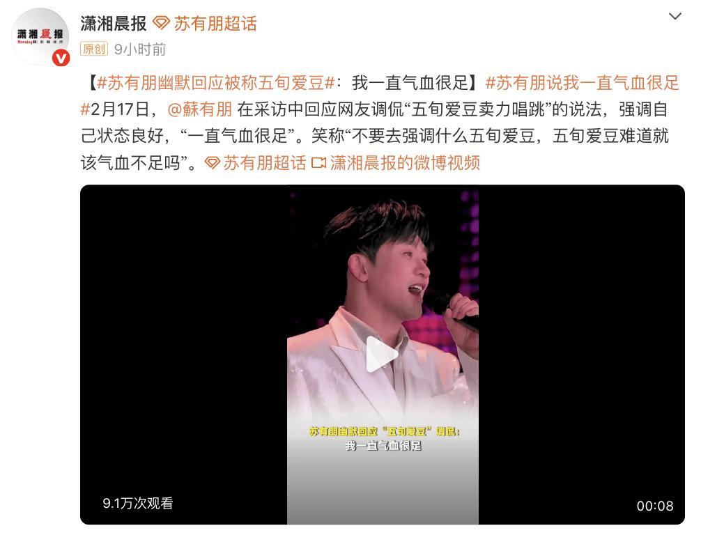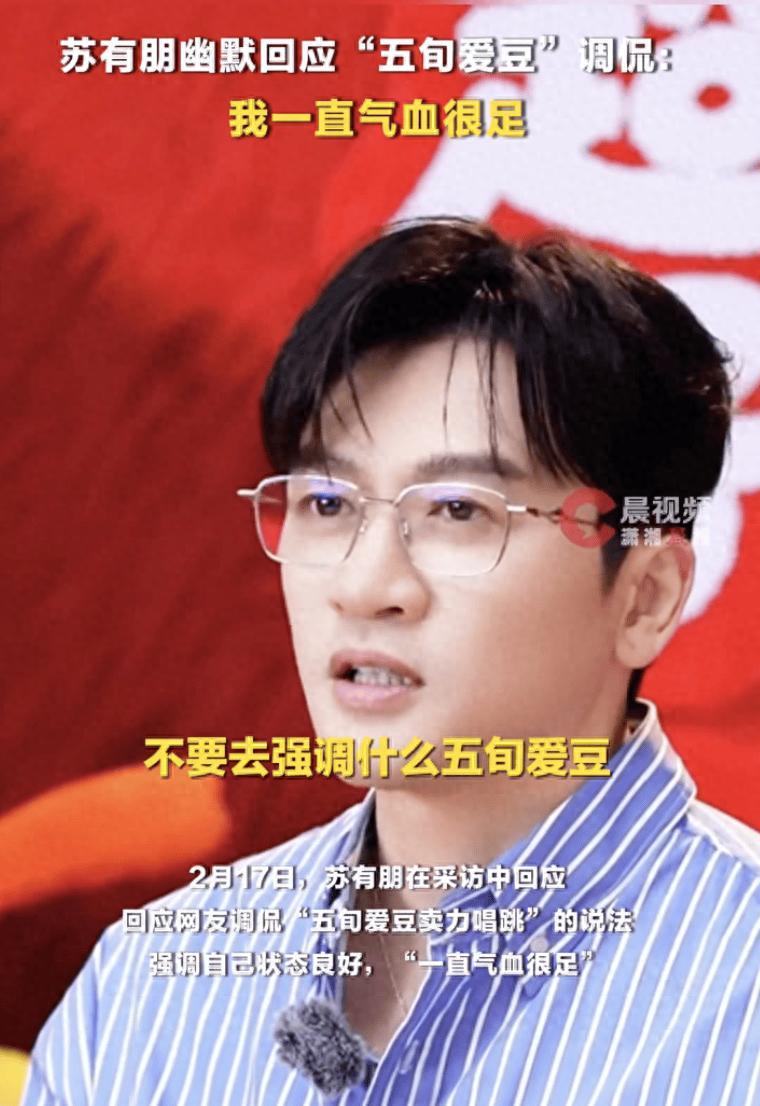 2月17日,蘇有朋在採訪中回應網友調侃“五旬愛豆賣力唱跳”的說法,強調自己狀態良好,“一直氣血很足”。他笑稱“不要去強調什麼五旬愛豆,五旬愛豆難道就該氣血不足嗎”。