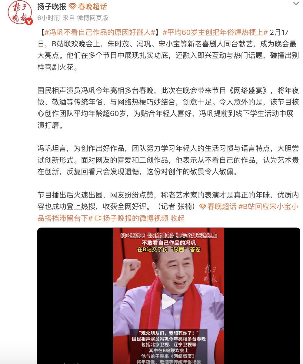 2月17日,B站聯歡晚會上,朱時茂、馮鞏、宋小寶等新老喜劇人同臺獻藝,成爲晚會最大亮點。他們在多個節目中展現紮實功底,還融入即興互動與熱門話題,碰撞出別樣喜劇火花。