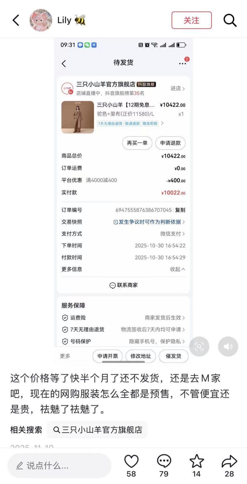 “ 買個衣服還買成期貨了”,儘管三隻小山羊承諾提供終生養護和不降價,卻仍然存在發貨問題,因爲傳統的羊絨大衣生產鏈需要足夠的時間確認生產細節,而電商則要求工廠可以快速反應做到小單快反,同時也不免會生出“是否把退貨發給第二批客戶”的質疑。