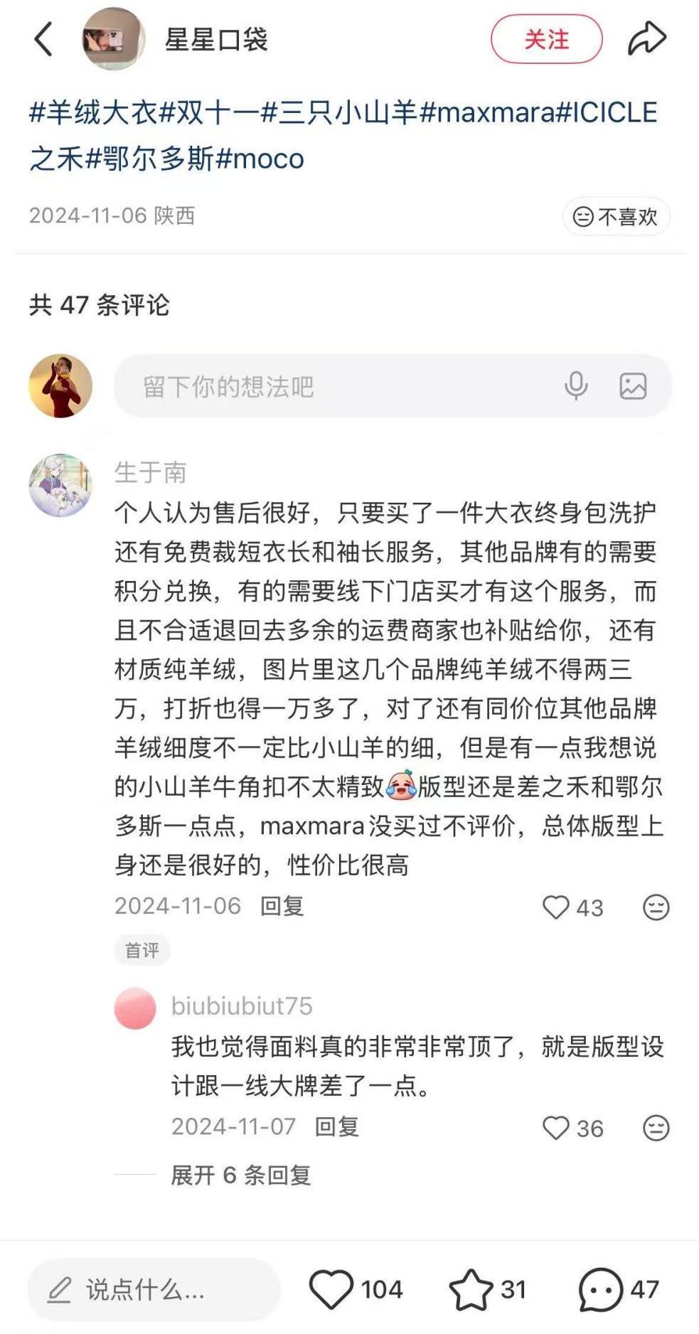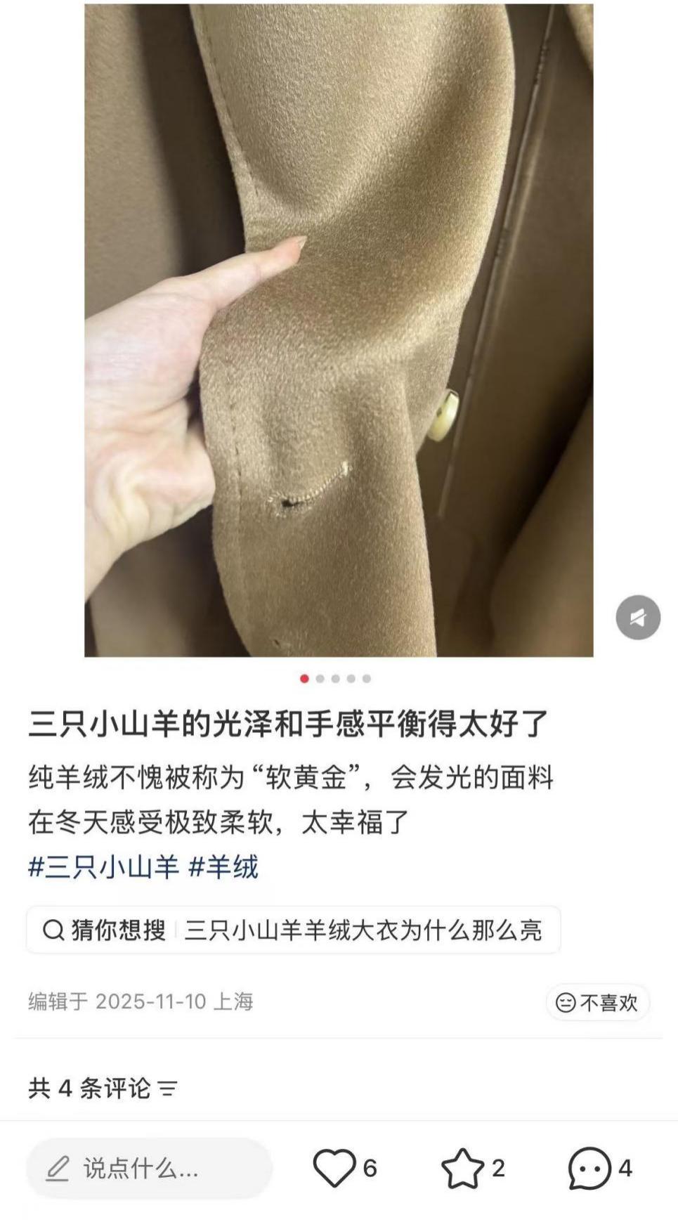 實際上這兩種技術並不是三隻小山羊的專利。相反,老牌羊絨出於低調含蓄的審美和市場定位,會傾向於保留原料本身自帶的油脂光澤,避免燙光帶來的“假亮感”,但三隻小山羊卻需要更有衝擊性的感受來吸引消費者,這也反映出它和老錢羊絨的賽道並不相同。此外也有人吐槽它“相較於其他品牌版型一般、設計太老”,而對於一個服裝品牌來說,這無疑是增長的隱形天花板。