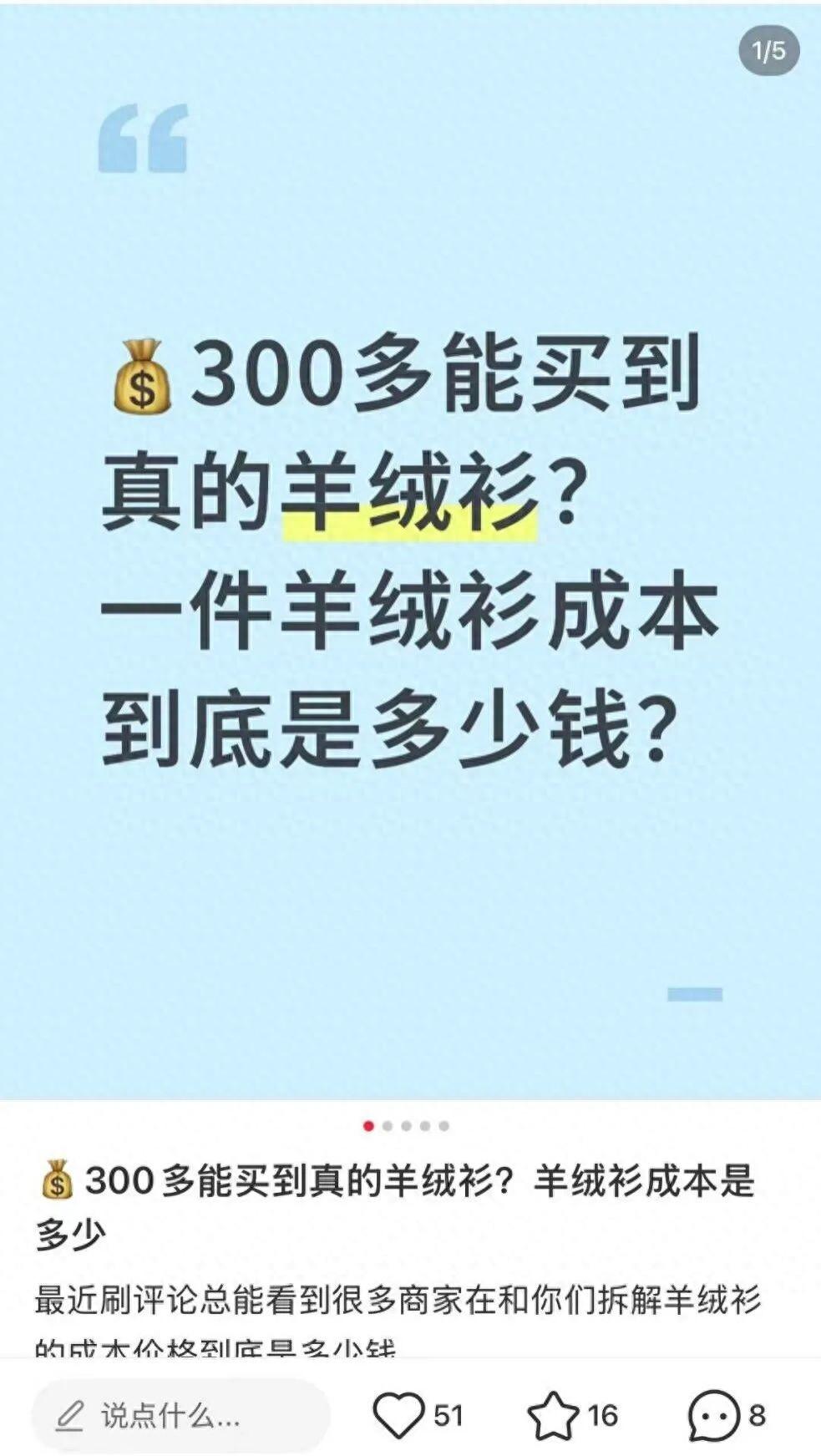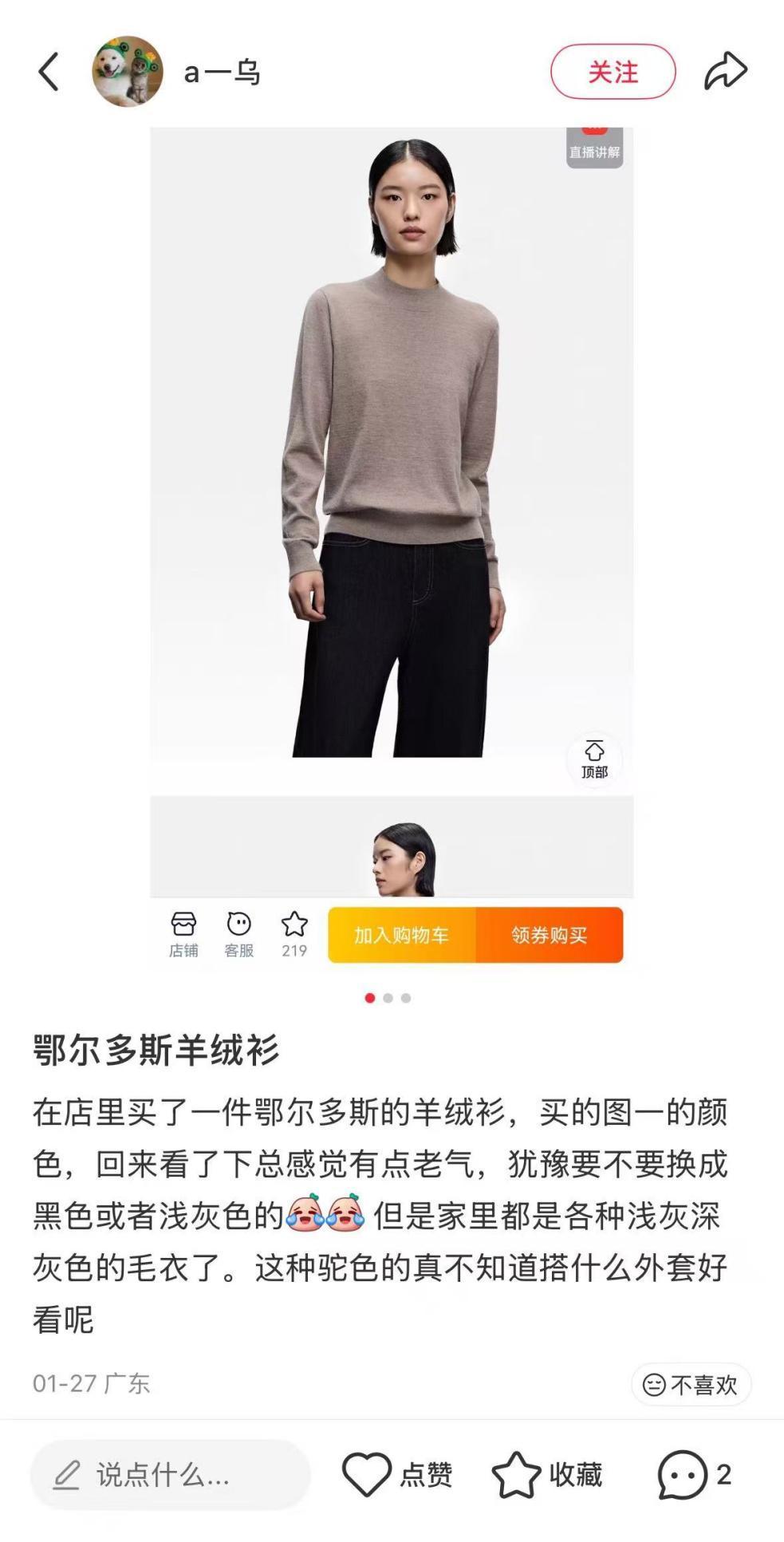 在社交媒體上搜索關鍵詞“羊絨”,羊絨衣物的熱度卻不如戶外、運動、羽絨服等服裝品類,且形成了完全相反的兩種聲音。羊絨的擁躉會爲它柔軟細密的質感反覆購買,但是另一羣消費者也會吐槽羊絨“太貴”“款式老舊”“不好打理”。