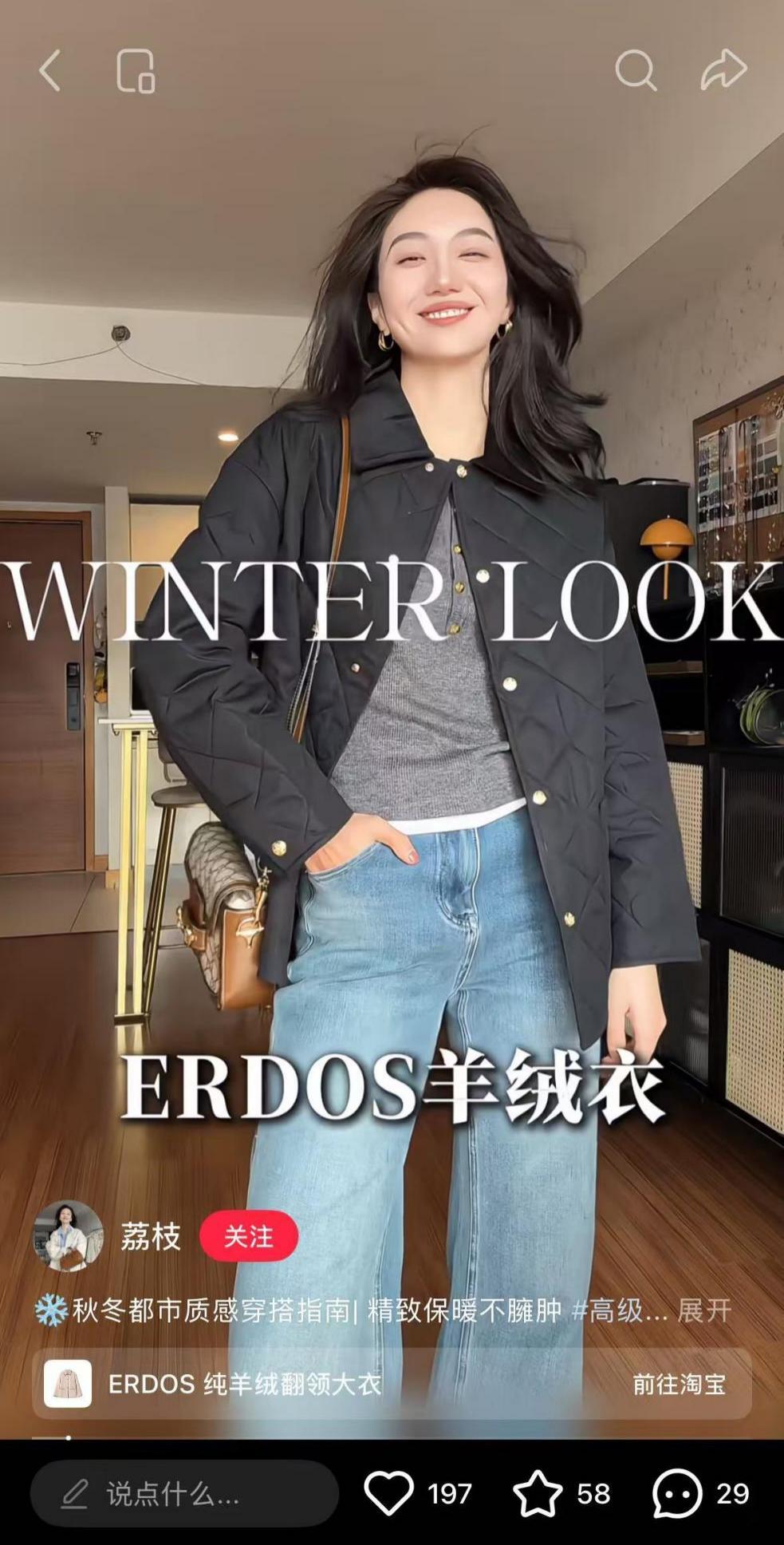 在鄂爾多斯1980 官宣了趙麗穎做代言人後,該品牌似乎也動搖了原本的中年人賽道,尤其是在2000-4000 的重合價格帶中,開始嘗試用不同款式來製造差異化。“鄂爾多斯的羊絨衫買回來發現還是有點老氣”,雖然網上還是有吐槽它款式老氣的聲音,但是近幾年ERDOS已經越來越多地出現在穿搭博主的推薦裏。
