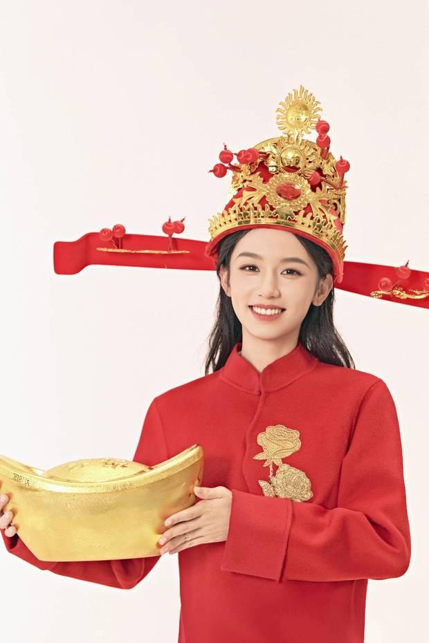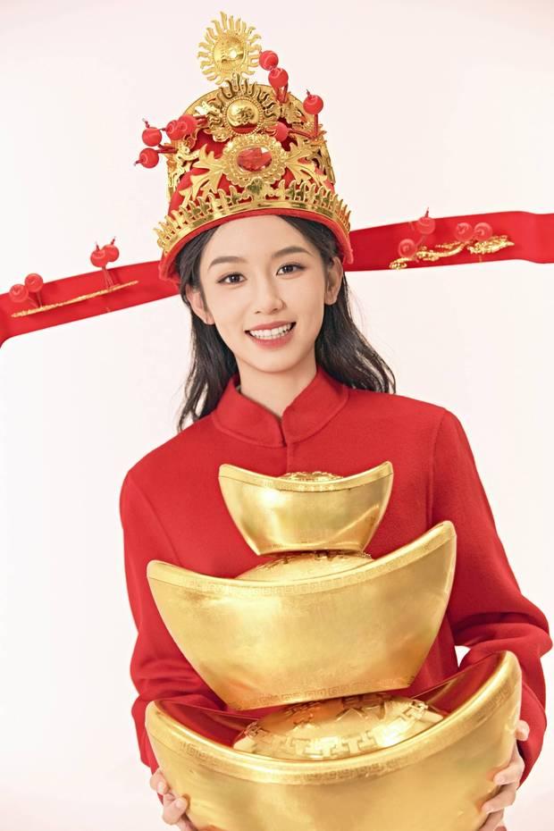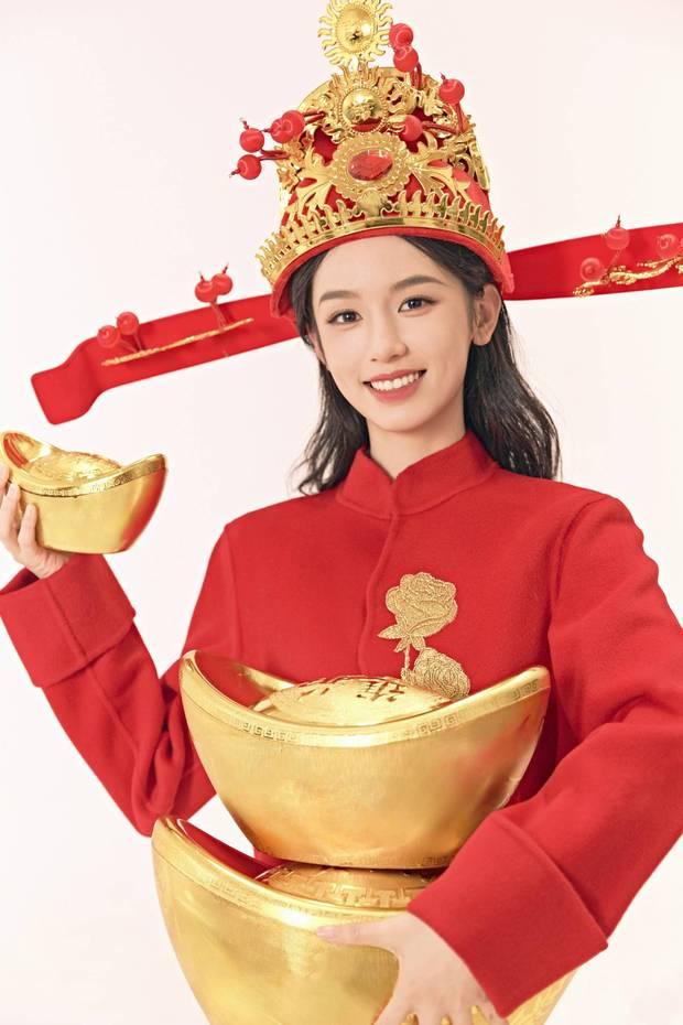 周也手捧大金元寶,笑容明媚,滿是新年招財的喜慶感。