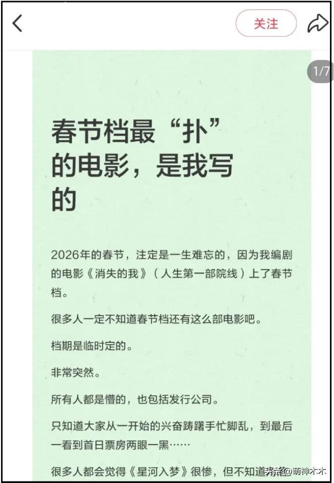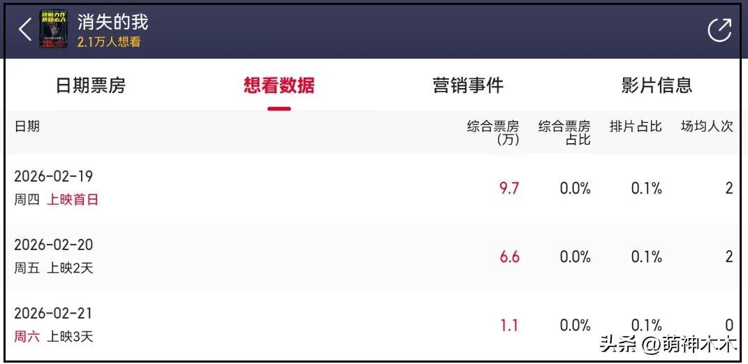空降春節檔、日票房排名20,排片佔比0.1%,票房佔比小於0.1%,場均人次0.5、上座率0.4%——以上數據放到冷門檔期都是撲街中的撲街,竟然出現在了2026年春節檔,連《消失的我》編劇本人都覺得離譜,主動發聲透露了春節檔電影內幕。