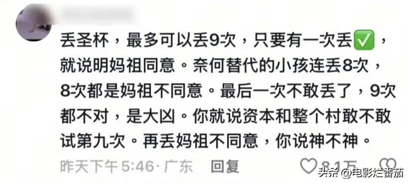 更戲劇性的是,男孩剛上轎,巡遊就出現了狀況,甚至到了無法繼續進行的地步。現場慌亂之下,衆人決定讓小男孩用聖盃問媽祖,結果卻連續8次都是怒杯(概率僅0.3%)——按當地說法,這是媽祖明確不同意。民間更有說法,如果9次怒杯將會給全村招致噩運,富商一家再蠻橫,也不敢賭這一步。