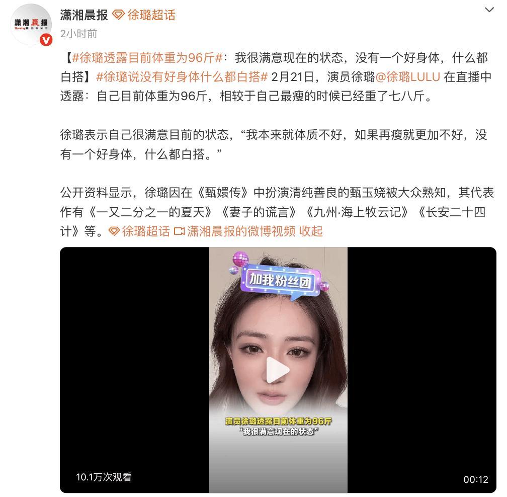 2月21日,演員徐璐在直播中透露:自己目前體重爲96斤,相較於自己最瘦的時候已經重了七八斤。