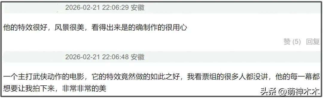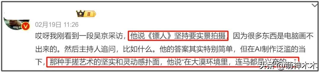 不少網友都誇讚《鏢人》的鏡頭美學,還以爲是特效。但吳京採訪的時候透露過,他堅持實景拍攝。雖然前期投入巨大,但從觀衆滿意度來看,吳京這錢花的也挺值。