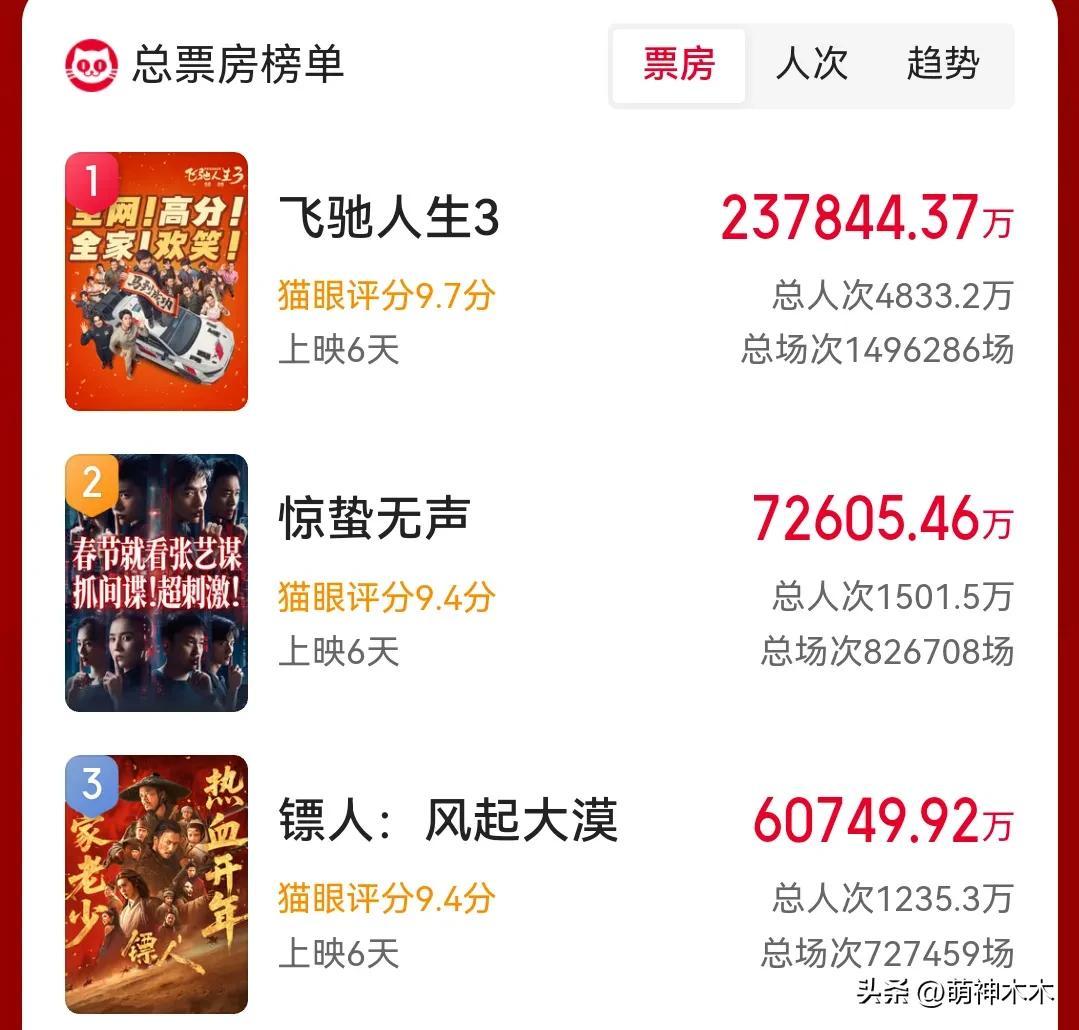 左邊是《飛馳人生》續集佔據ip基本盤,右邊是《驚蟄無聲》的“春節就看張藝謀”,《鏢人》在這個春節檔也算是“夾縫生存”了。