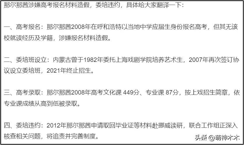 ——那爾那茜定向委培事件相關通報明確表示,那爾那茜涉嫌高考報名材料造假,畢業後又單方面違約,可以說是劣跡斑斑。