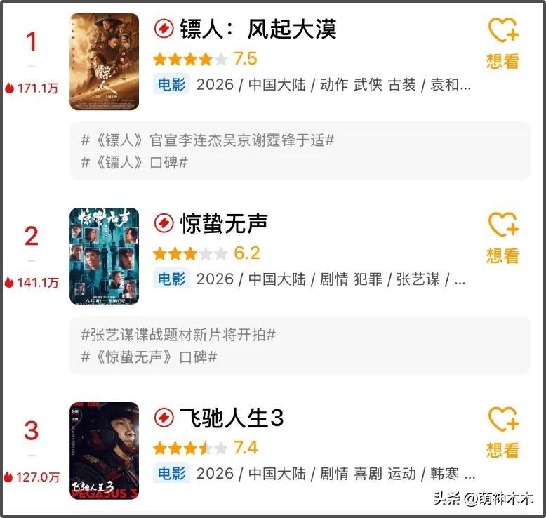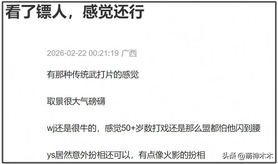 尤其是《鏢人》的主演雖然是大咖,但流量熱度並不是非常高。好在影評口碑的反饋不錯,從開分7.5就一直保持,2026年的春節檔,穩定可不容易。