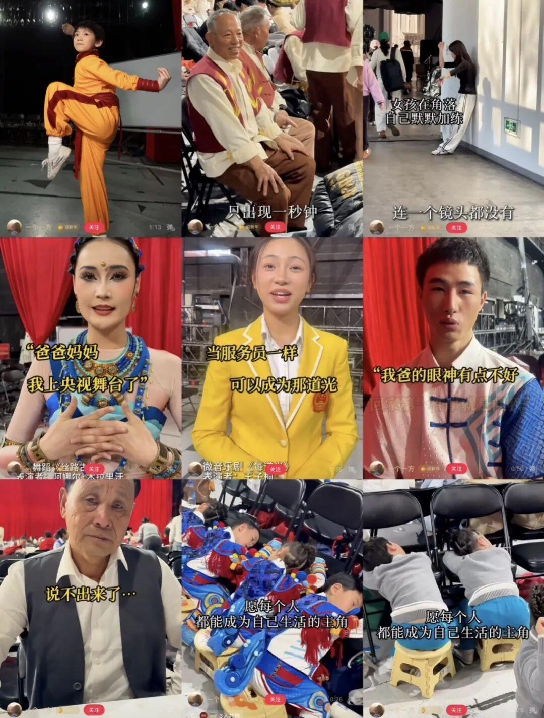 即便在“你會記得春晚上只出現1秒鐘的人嗎”的視頻裏,也有演員只出現了一秒鐘。他們是累得睡着了的小演員,沉沉把頭靠在休息椅上。他們是在舞蹈排練時,和同伴一起閃現的舞者。他們也是坐在道具一角,默默喫盒飯的工作人員。