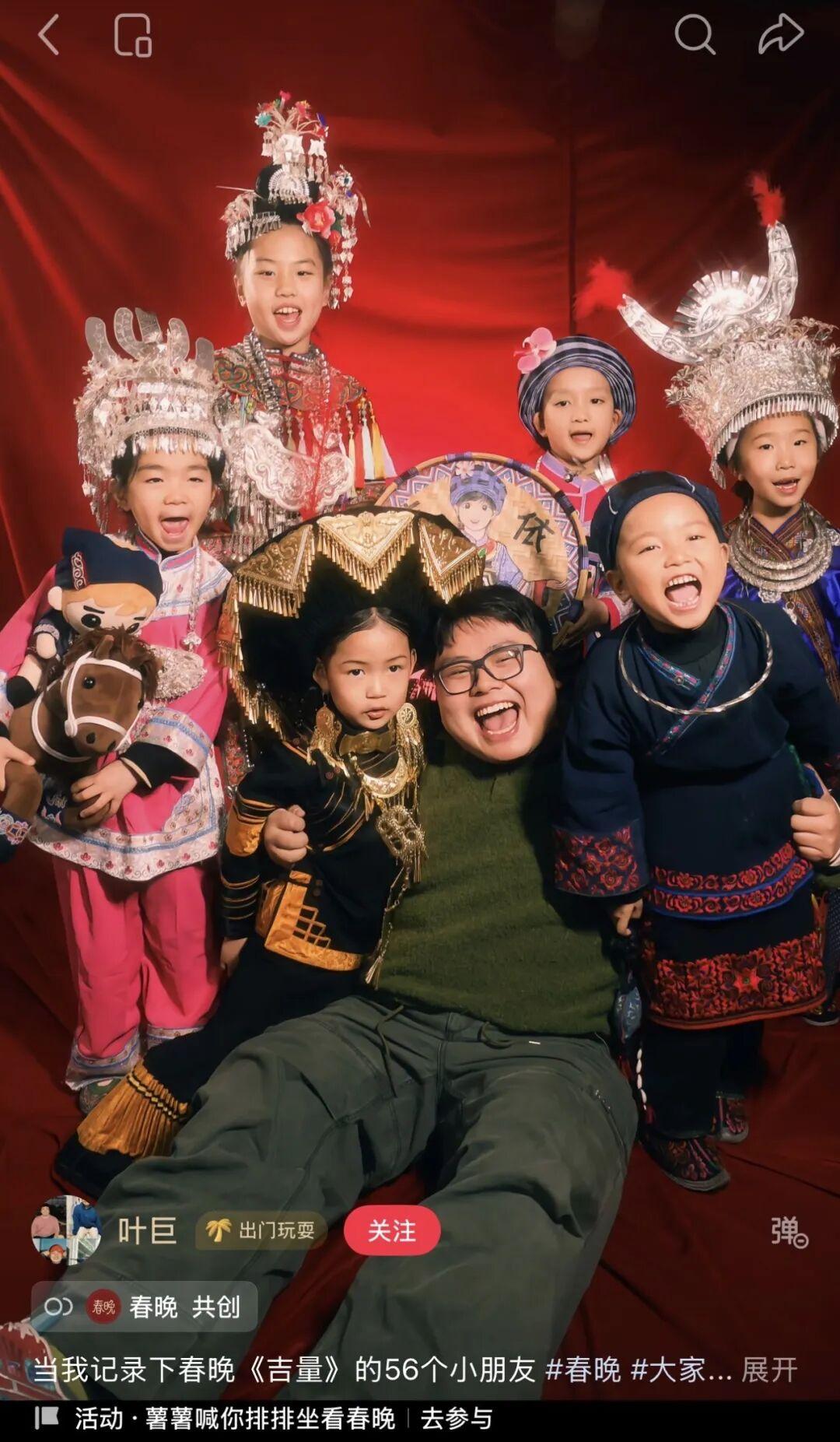 葉巨記錄下了《吉量》中56個小朋友的動人瞬間。他們穿着各具特色的民族服飾,對着鏡頭晃動稚嫩的小手,奶氣地表達上春晚的感受。“舞臺升起來的時候很緊張”、“很開心”、“非常開心”,帶着緊張和興奮小心翼翼地踏上舞臺,何嘗不是每個人初出茅廬觀察世界的心態?