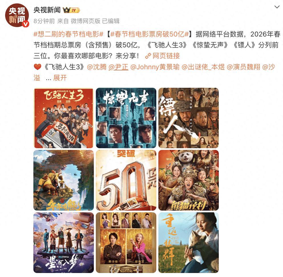 據網絡平臺數據,2026年春節檔檔期總票房(含預售)破50億,《飛馳人生3》《驚蟄無聲》《鏢人》分列前三位。