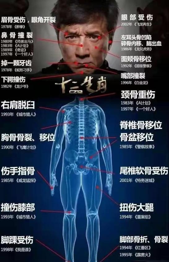 有影迷統計過大哥的受傷事件,比較主流的說法是他骨折多達76次。