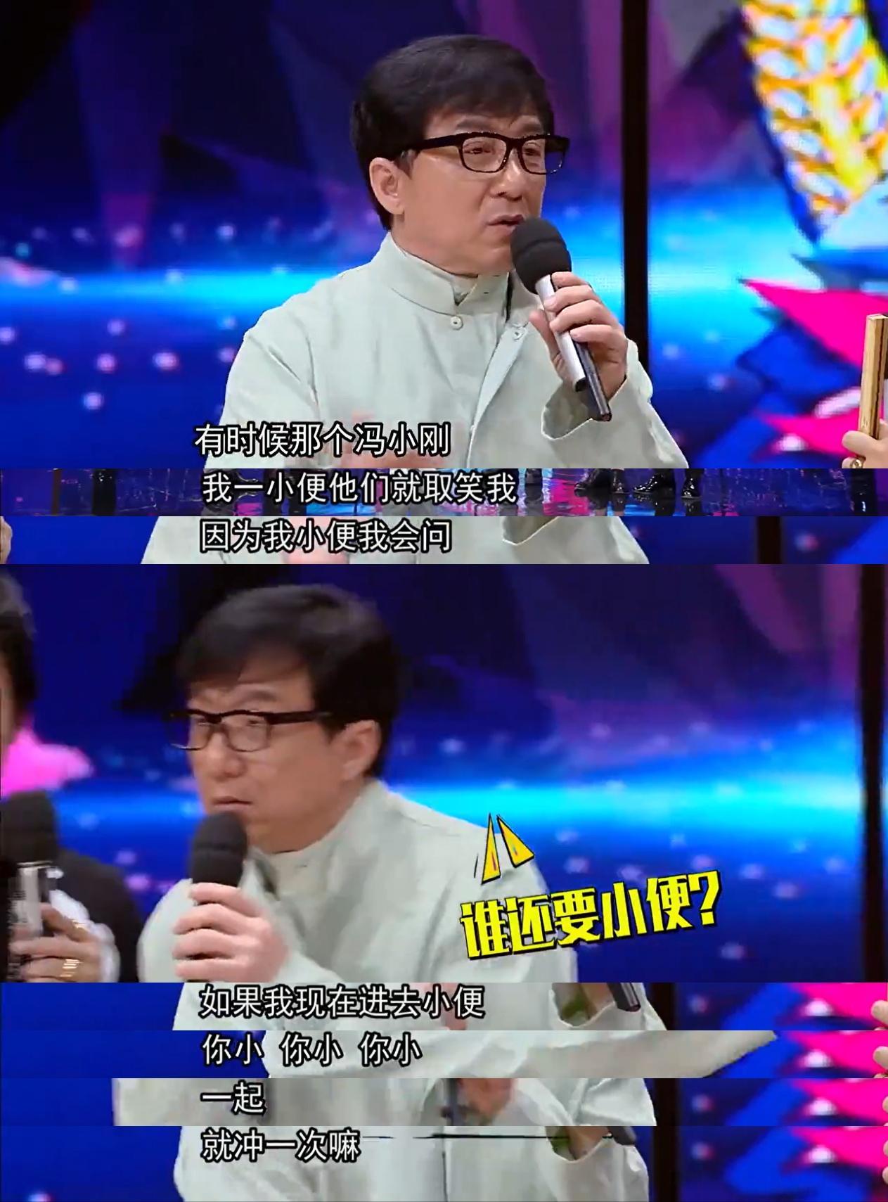 當年在《天天向上》舞臺上,成龍還自嘲因爲他召集人們組團上廁所被馮小剛等人嘲笑。
