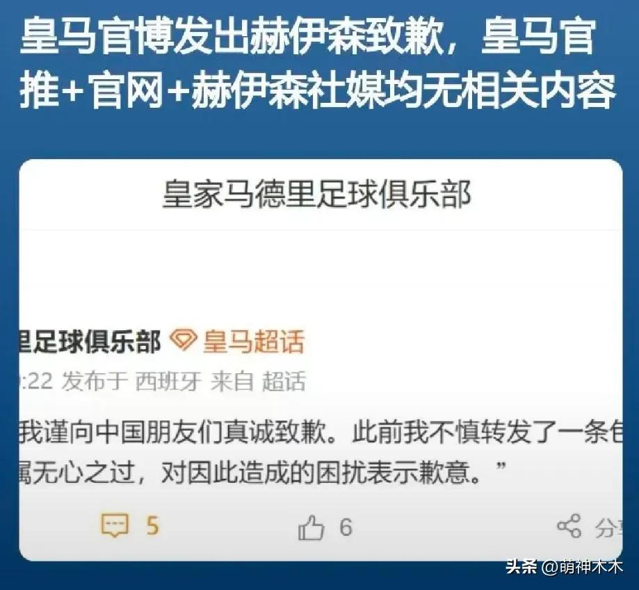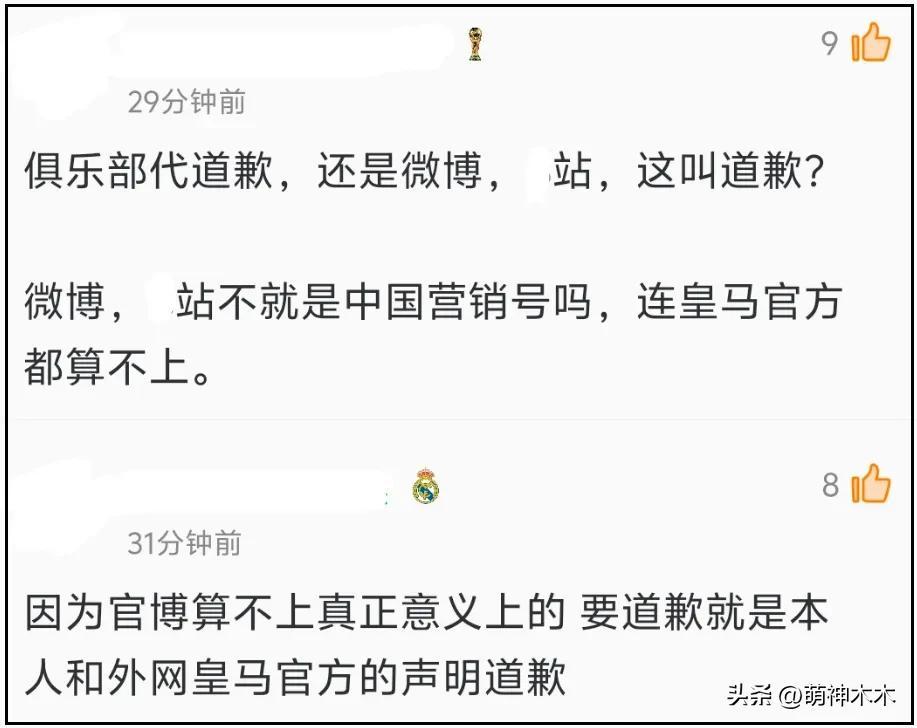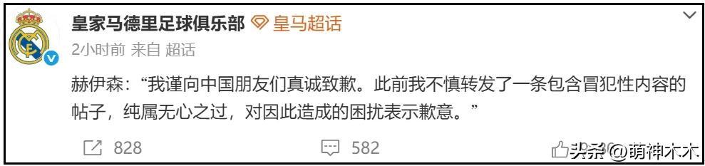 目前,皇家馬德里足球俱樂部賬號分別在微博和某站發佈了道歉動態,內容如下: