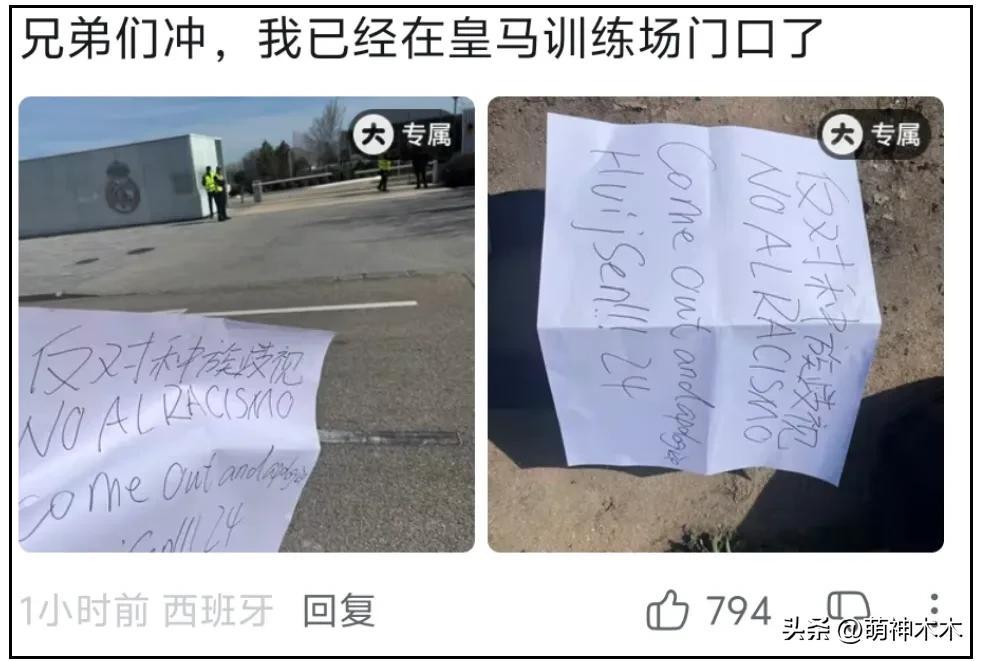 皇馬俱樂部某站賬號評論區,就有IP定位西班牙的網友留言,他曬出了自制反歧視標語,強調會前往皇馬訓練場表達態度,從網友曬出的照片看,他真的去了現場,爲網友執行力點贊!