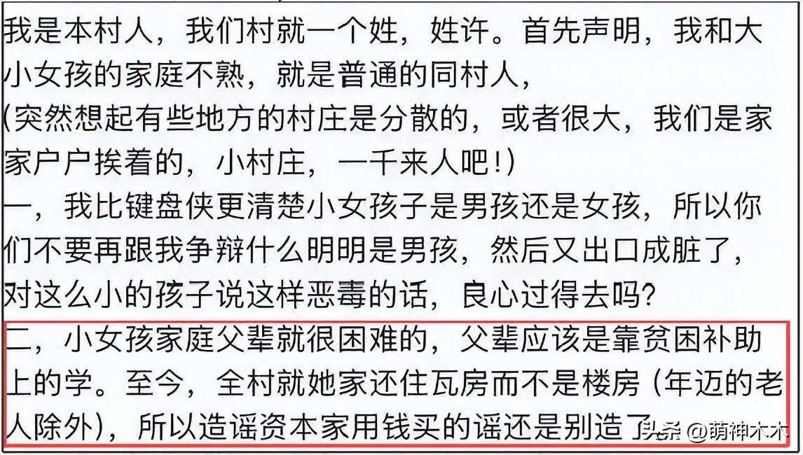 而後,有網友翻出早前村民爲10歲女童澄清的消息,當中一些爆料細節與通報相互呼應。有村民稱村裏一共一千來人,10歲女童家庭從父輩起就生活困難,父輩上學靠貧困補助,而今村裏只有他們家還住瓦房,其他人都住樓房,特別強調個別老人除外。