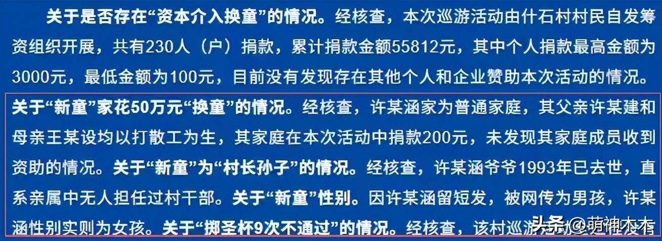 與換童風波關聯最深的是——“耀祖”、“50萬資本”、“村長孫子”等標籤,通報指出都是造謠,證實小孩實爲女童,一家人以打零工爲生,出身普通家庭,直系親屬無人擔任過村幹部,爺爺早已去世。