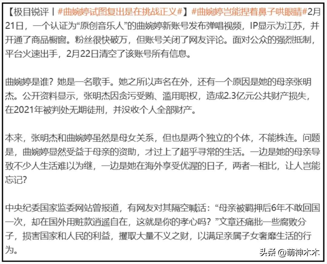 最近曲婉婷和她的罪犯母親連上三條熱搜,分別是“曲婉婷賬號沒了”、“曲婉婷母親濫用職權致2.3億損失”、“曲婉婷多年來從未公開道歉”,每條熱搜話題下方都有質量很高的網友留言和媒體評論。