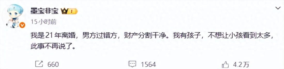 搜狐娛樂訊 25日,知名作家、編劇墨寶非寶宣佈已於21年離婚,並表示離婚原因是男方過錯方,財產分割乾淨。對於網傳離婚時分稿費,她回應稱:“假的”。