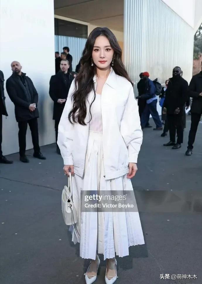 先來看一下楊冪的生圖,39歲的她皮膚保養不錯,但是氣質及穿搭不夠時髦,休閒款的夾克搭百褶長裙不顯身材,拍照動作也有一些拘謹,看着畏畏縮縮,頭身比也有些差,尤其是頭特別大,肩膀比例很虐。