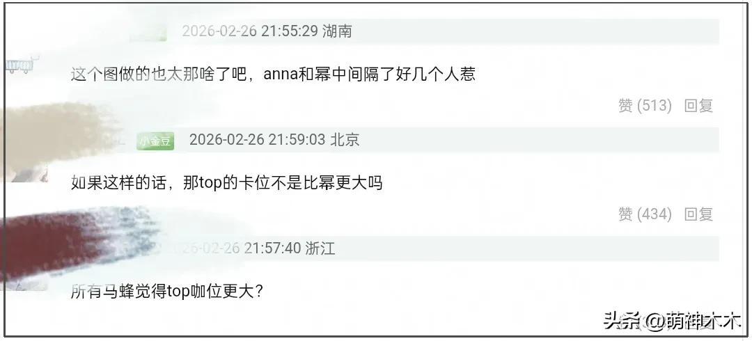 而細看的話,安娜和楊冪之間還間隔了十幾個人,並非只有一個男團,幾乎是一頭一尾了。