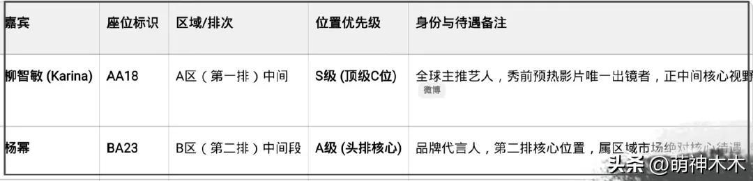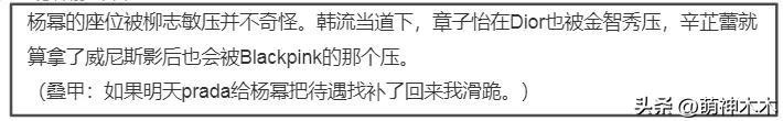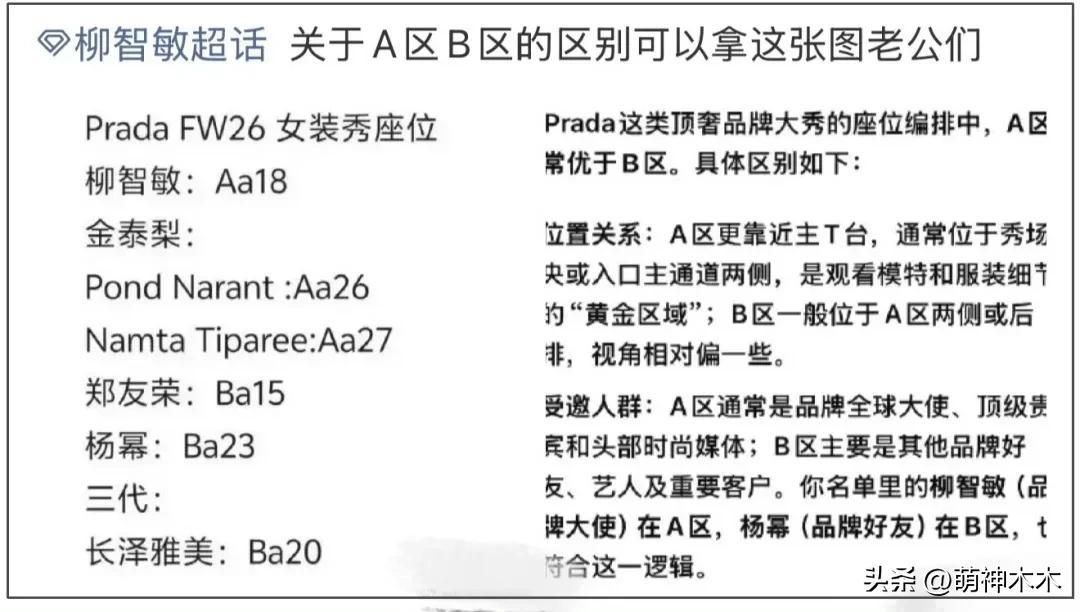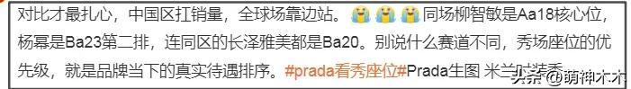 關於座位問題,柳智敏的粉絲列舉了A區與B區的區別,稱A區是第一排,全球主推的藝人,看秀視野也更好,B區則是稍微低一級別的藝人,是品牌大使和品牌好友的區別,柳智敏待遇就是比楊冪好。