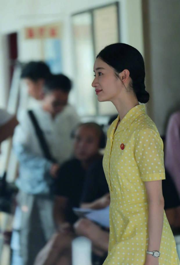 郭曉婷身着黃底白點連衣裙,在人羣中側行淺笑,氣質清新又靈動。