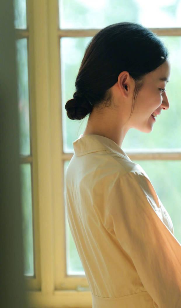 郭曉婷在窗邊側頭淺笑,暖光勾勒溫柔側影。